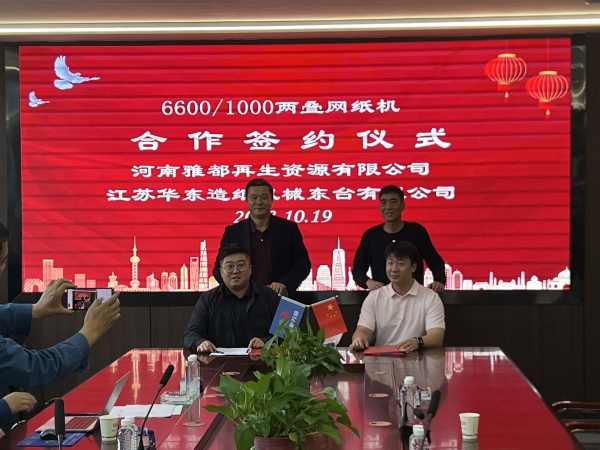 2023年10月19日,江蘇華東造紙機(jī)械東臺(tái)有限公司與河南雅都再生資源有限公司簽訂6600/1000M兩疊網(wǎng)紙機(jī)。